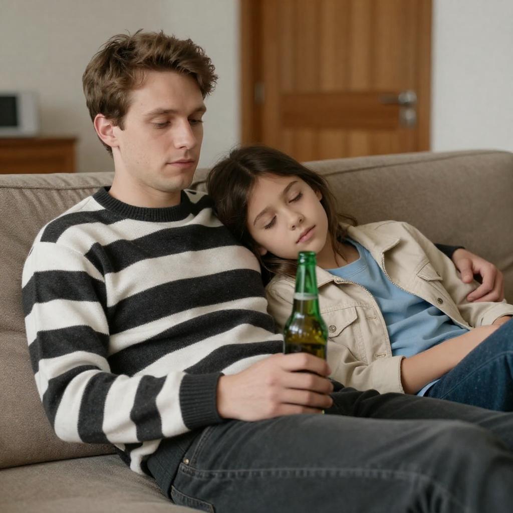 Photograph of a man with curly brown hair and a gray shirt hugging a young girl with long brown hair in a pink shirt. The man's eyes are closed, and the girl's face is pressed against his chest. Background shows an indoor setting with blurred lights and structures. Both are in an emotional embrace.
