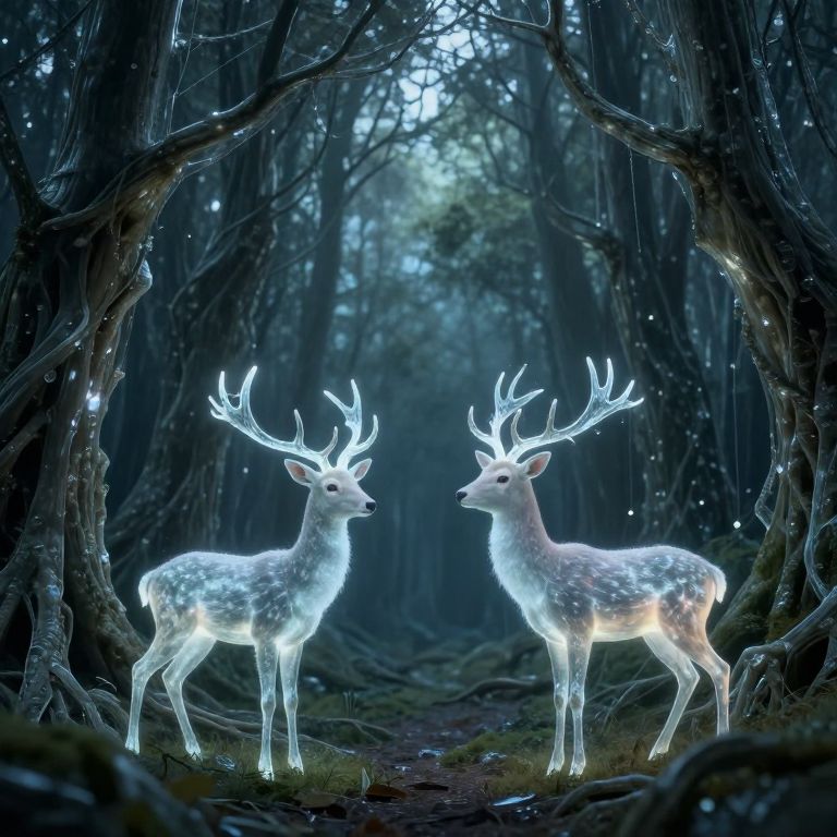 In a misty woodland where roots twist like veins of liquid shadow, ethereal deer with luminous, translucent bodies and glowing antlers stand as if conjured from moonlight, their forms defying the boundaries between flesh and light.
