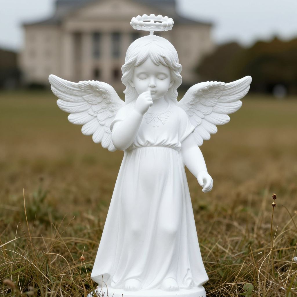 Photograph of a white, detailed angel statue with wings, halo, and dress, standing in a grassy field with a blurred, classical-style building