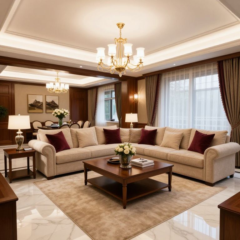 Luxuriously designed living room featuring a plush L-shaped sectional sofa adorned with beige and burgundy throw pillows, positioned centrally on a beige rug over polished marble flooring, complemented by a wooden coffee table holding books and floral decor, flanked by two side tables with lamps, and illuminated by a grand chandelier hanging from a tray ceiling with recessed lighting, while a dining area with six chairs and a vase of flowers is visible through a corridor in the background, all enclosed by warm-toned wood paneling and large windows draped with brown curtains.