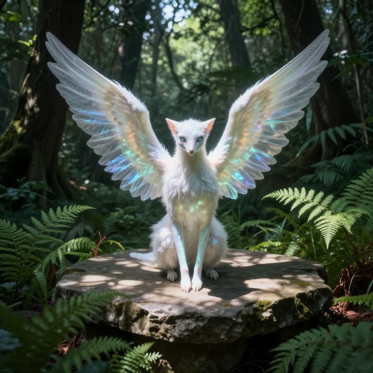 Photograph of a glowing, white, winged cat with iridescent feathers sitting on a forest rock, surrounded by ferns and dappled