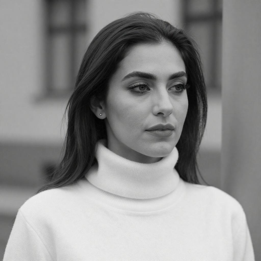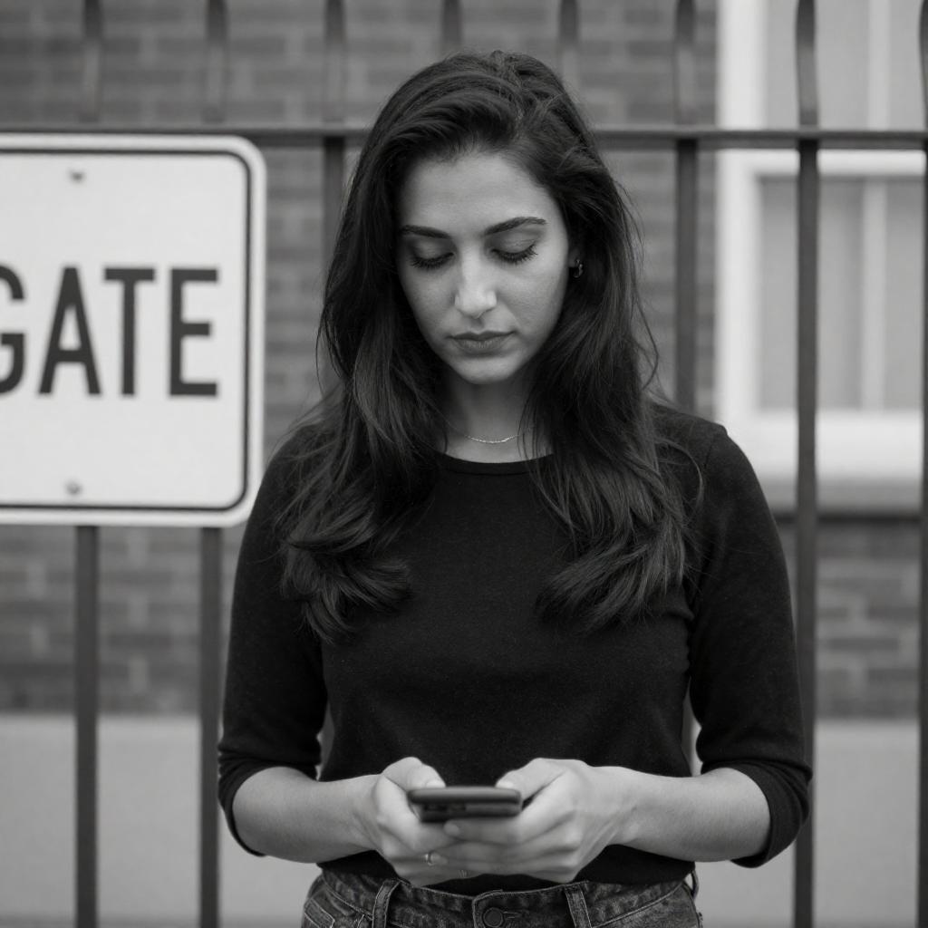 Black-and-white photograph of a woman with long, dark hair, wearing a black top, standing behind a metal fence. She holds a dark object in both hands, looking downward with a neutral expression. A sign with "GATE" is visible on the left. Background includes a brick wall and blurred windows.