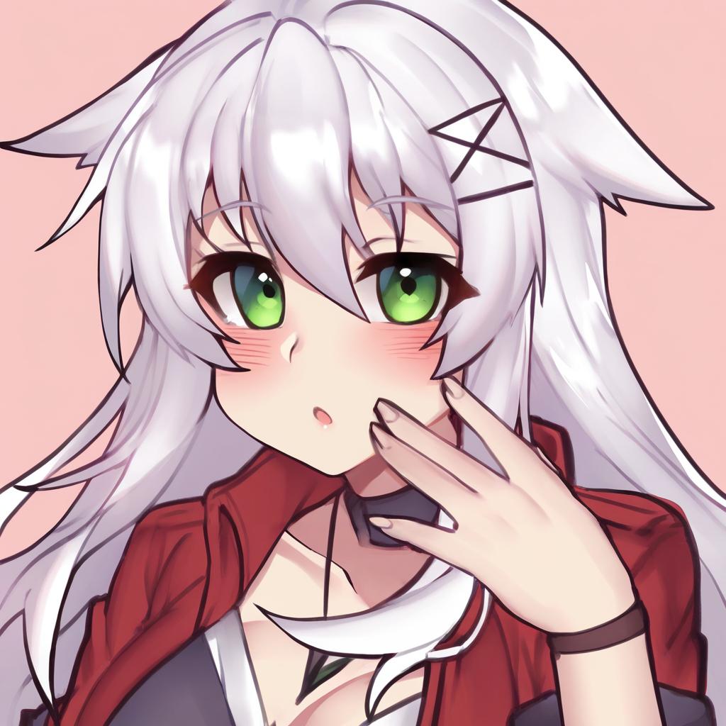 Digital artwork of an anime-style girl with long white hair and green eyes. She wears a red jacket over a black and white top, accessorized with a black choker and two hair clips. The character has a slightly surprised expression with a hand near her face. Soft pink background.
