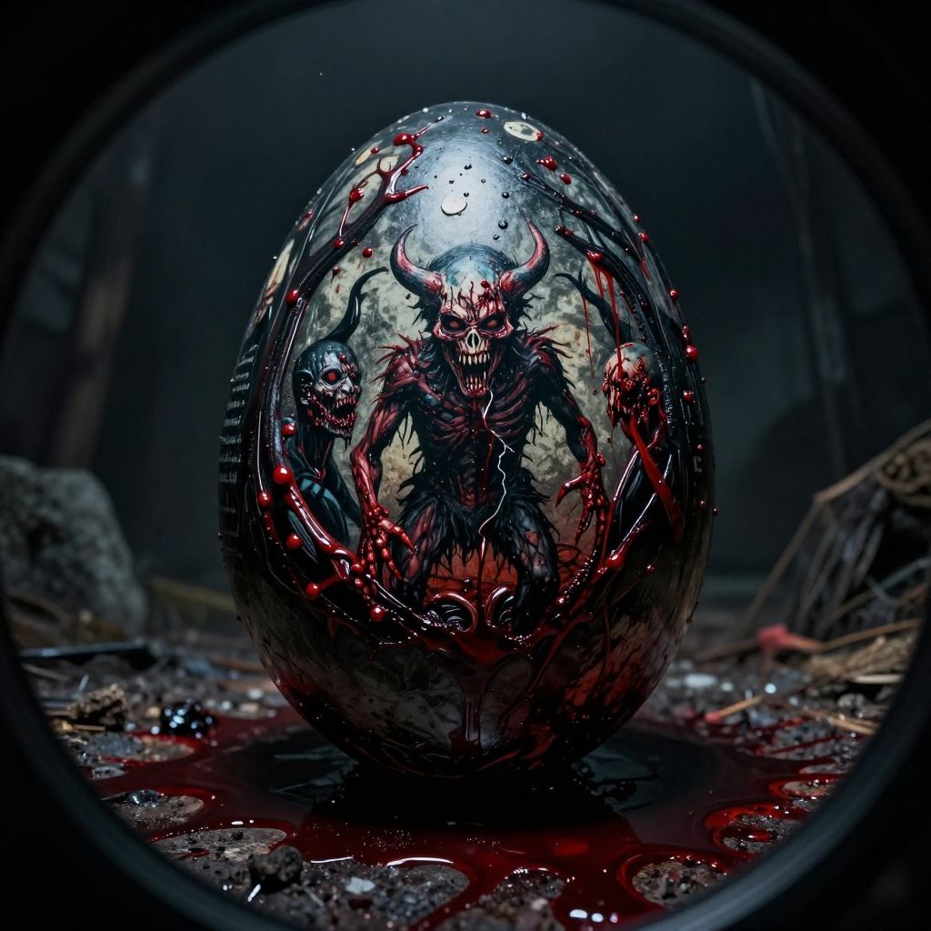 Perfect photograph, Giant black Faberg egg (textured pysanky egg) with a graphic, gruesome, demonic, and bloody horror scene depicted on it.: Breathtaking dark cinematic photo, frightening and dramatic photograph, terrifying Getty Images, disturbing experimental view lit from the ground, experimental angles, fisheye view, blood splatter on lens, gore!