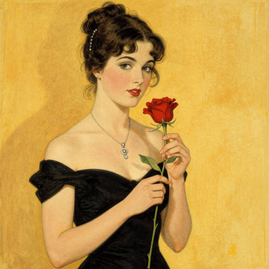 A vintage-inspired illustration reminiscent of Rolf Armstrong's 1935 style, featuring a woman in a black off-the-shoulder dress adorned with a delicate necklace, holding a vibrant red rose against a warm, textured yellow background.
