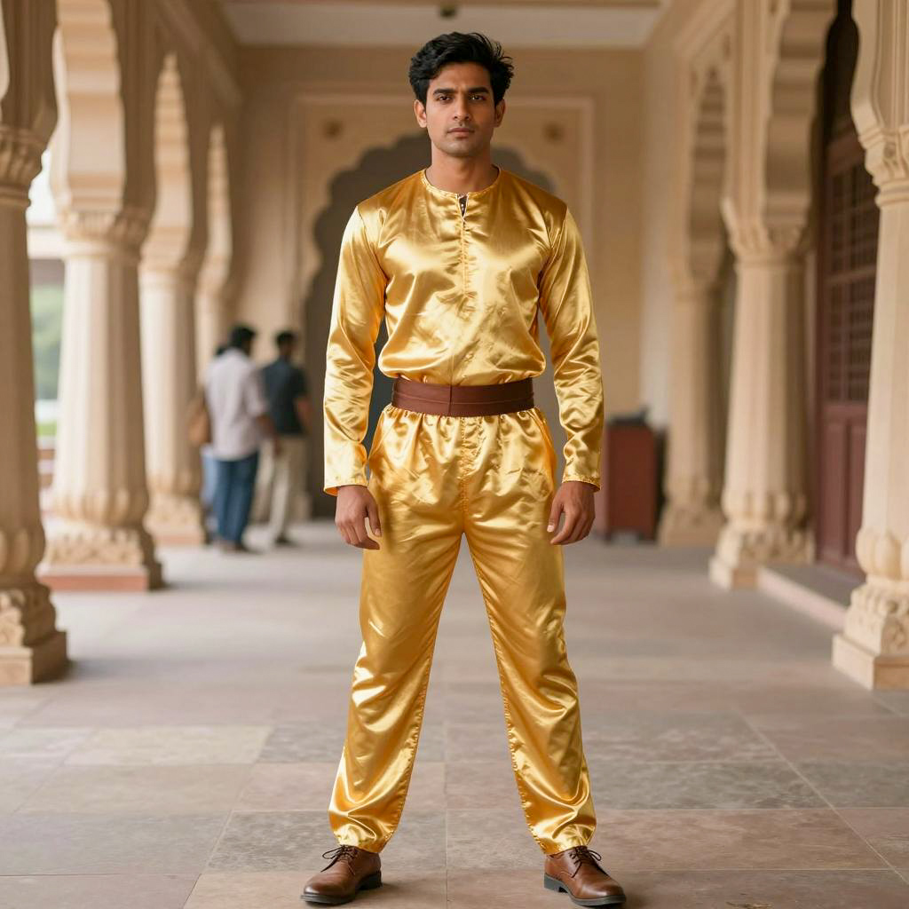 Gold pants costume, photorealistic, man standing in hallway, wearing shiny gold silk outfit, long-sleeve top and loose pants, brown belt, brown shoes, short black hair, confident expression, Indian architecture background, blurred people in distance, bright natural light, ured stone floor, warm color palette, fashion photography style