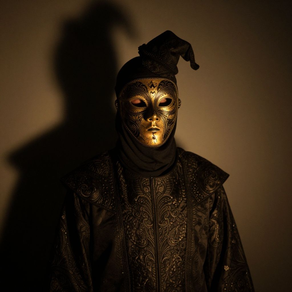 Photograph of a mysterious figure in a dark, ornate mask and black jester hat, illuminated with golden light against a shadowy background.