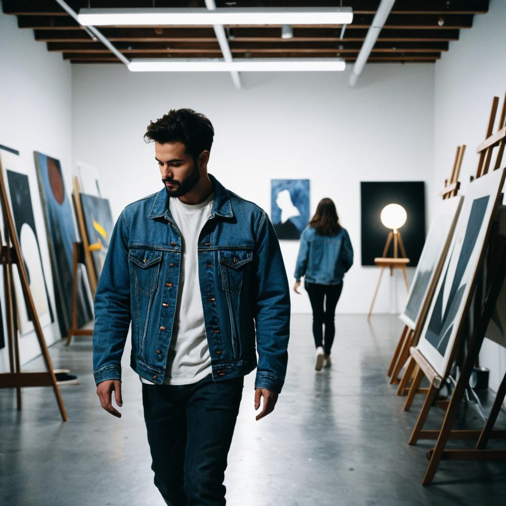 Realistic photo.An Artist wearing a denim jacket, walking through a contemporary art studio, under soft spotlighting.