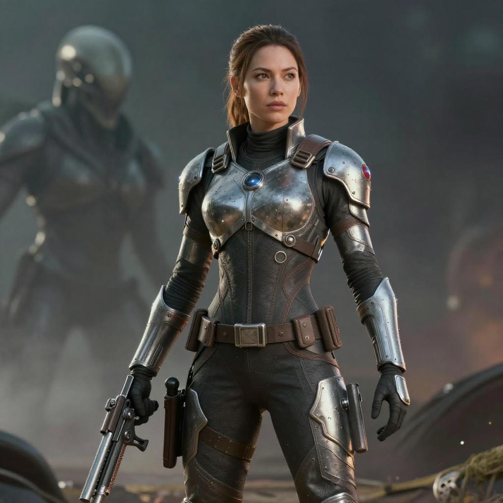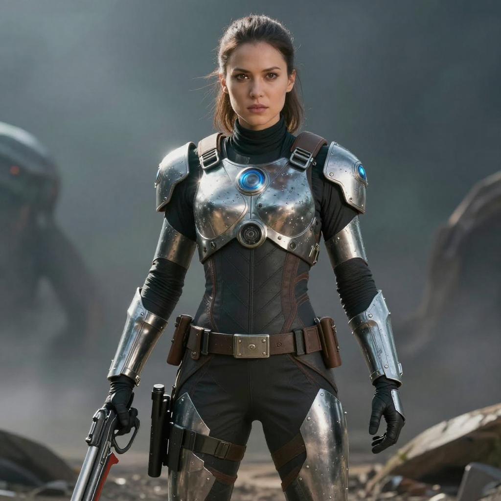 Create a highly realistic and cinematic portrait of a woman as she stands tall and unyielding against the alien threat, her weapons and armor glinting in the light. Utilize advanced photography and image editing techniques to perfectly capture her unique style and appearance, and incorporate elements of her surroundings or environment to add context and visual interest to the image. Make sure the image has high resolution and impeccable image quality to ensure a very realistic and dynamic appearance.
