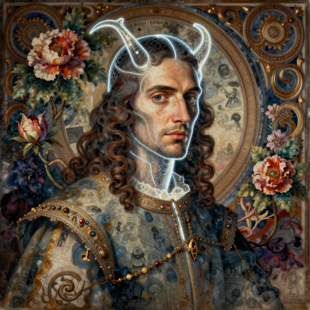 Looking at camera, renaissance philosopher, neon glowing contoured filigree detailed marvel, transparent venom character, layered rough textured comic style artistic masterpiece, portrait, many tiny sketches in one art, cinematic magic, Baroque, by Caravaggio, ornate fresco, detailed close-up dynamic color floral blossoming patterns, abstract expressionism, alcohol ink drawing, double exposure, book illustration, swirling spiral diptych two parts in one art.