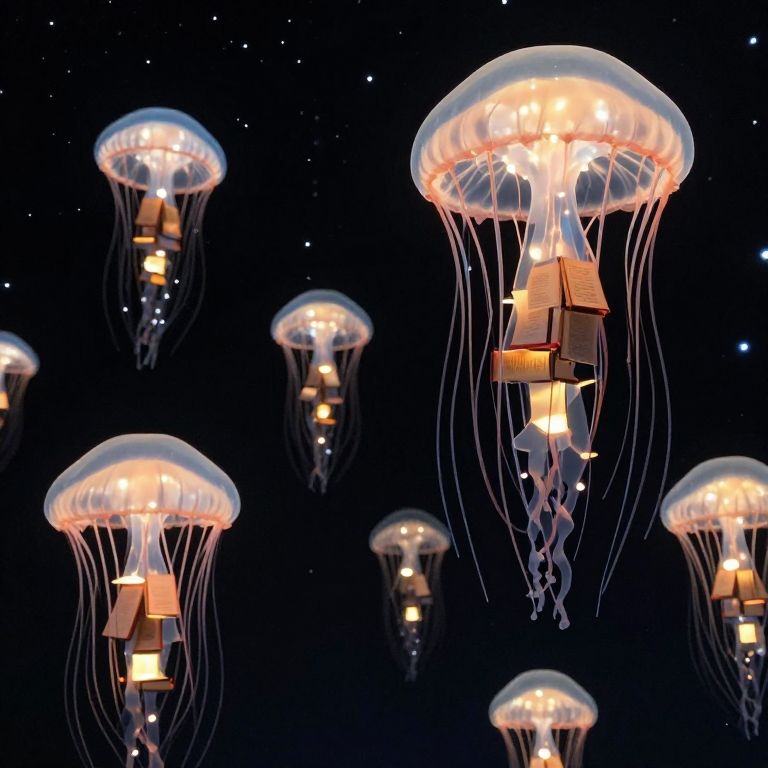 Glowing jellyfish-like structures drift gracefully through a starlit expanse, their translucent domes pulsating with warm light and cascading rows of illuminated books suspended within, creating a mesmerizing blend of celestial wonder and knowledge.