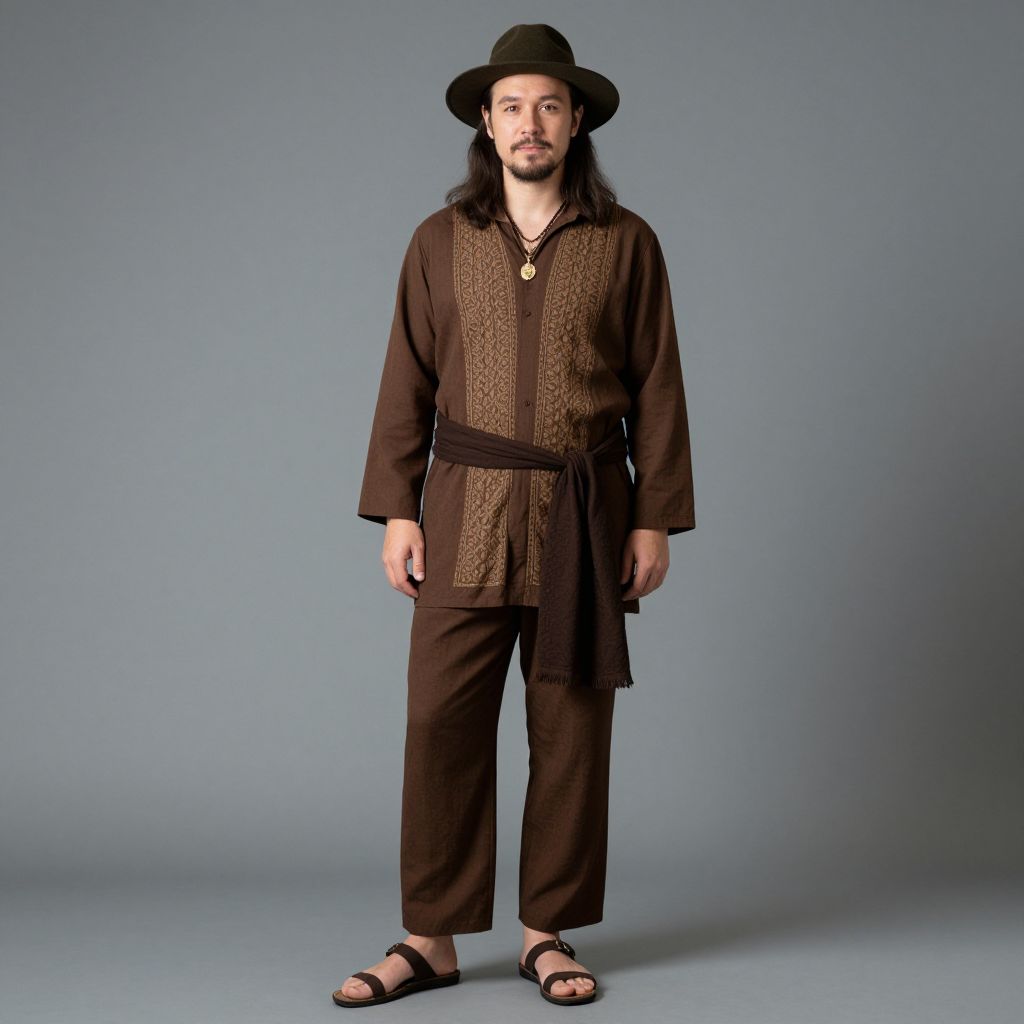 A man with long hair and a hat wearing a brown outfit with a pattern on the front and a brown scarf around the waist. He is also wearing a pair of sandals and a necklace with a pendant. The man has a relaxed and casual demeanor, with a confident presence. His long hair is styled in a natural, loose manner, and the hat adds a touch of sophistication to his appearance. The brown scarf around his waist is neatly tied, and the necklace with a pendant adds a subtle yet noticeable accessory. The overall image captures a sense of comfort and style, with the pattern on the outfit adding a unique visual element.