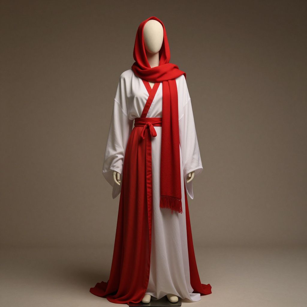 Photograph of a faceless, featureless mannequin wearing traditional attire. The mannequin is dressed in a long, white, loose-fitting robe with wide sleeves, secured at the waist by a vibrant red sash that also serves as a scarf, draped over the head. The red scarf and sash have a soft, textured fabric appearance. The mannequin stands against a plain, gradient gray background, casting a subtle shadow on the floor. The overall composition is minimalist, emphasizing the contrast between the white robe and the red sash, creating a striking visual effect.