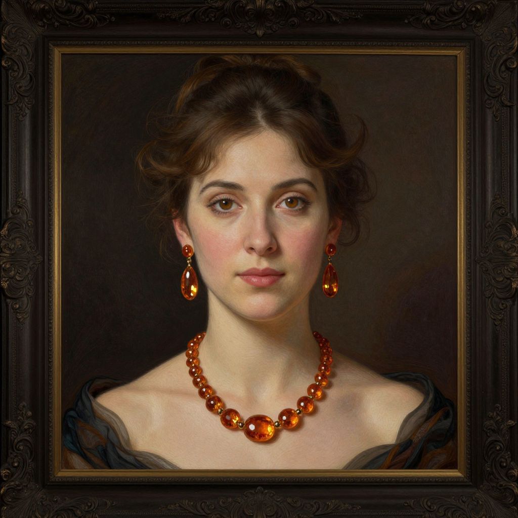 A classical portrait rendered in a hyper-realistic digital art style, featuring a woman adorned with an amber necklace and matching earrings, set against a dark, ornate frame, evoking the timeless elegance reminiscent of John Collier's work.