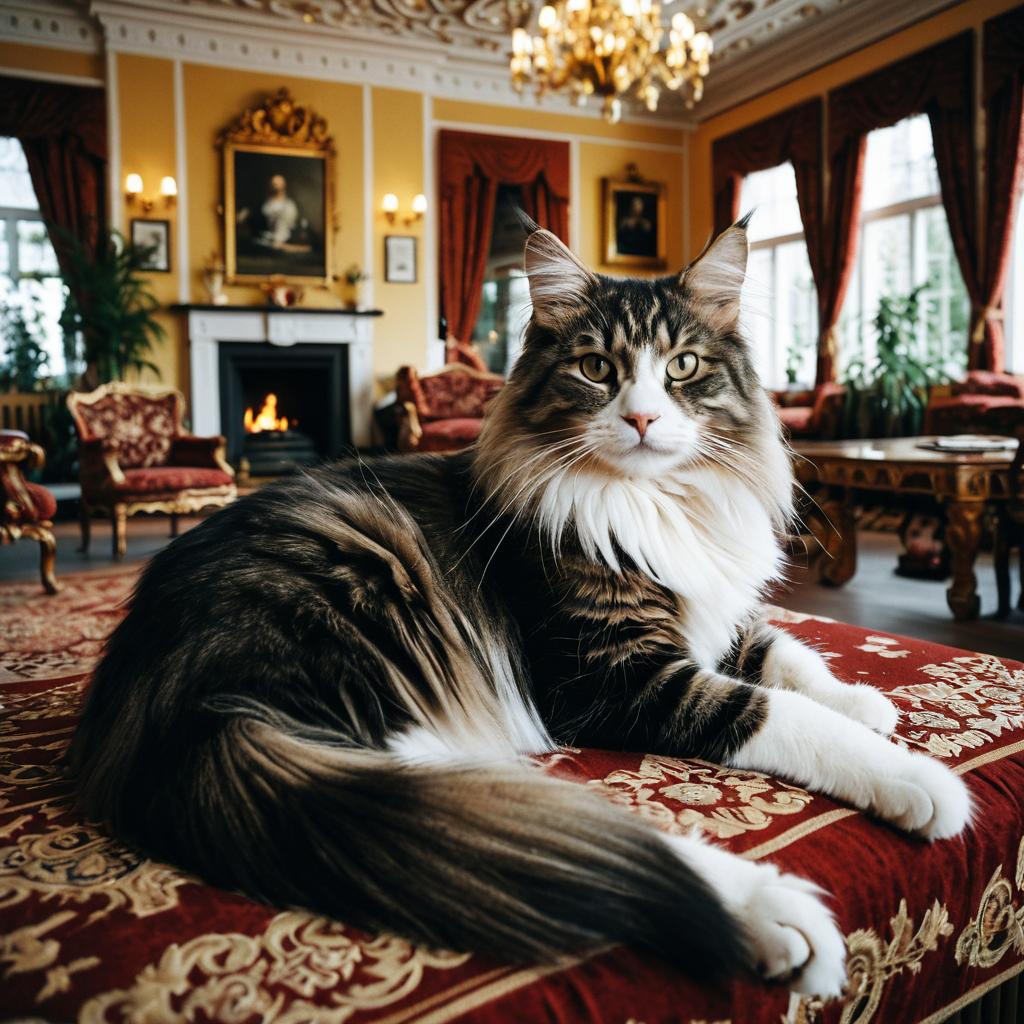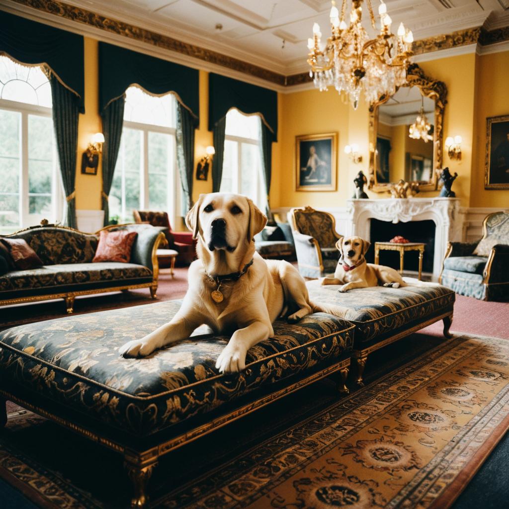 A sleek and elegant Doberman pinscher with a gold collar resting on an ornate cushion in a lavishly decorated room. The room features richly patterned upholstery, classic furniture, large arched windows with stained glass details, historic paintings, and a glowing chandelier, creating an opulent and grand atmosphere.