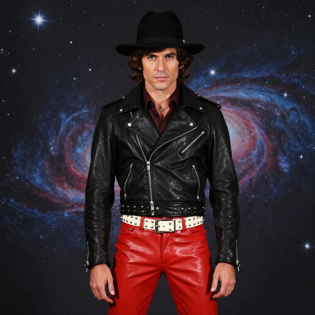 A man in a retro disco-inspired outfit stands confidently against a starry, cosmic backdrop. He wears a black leather jacket, red pants, a wide studded belt, and a black hat, evoking a vintage 70s-style aesthetic with modern flair.