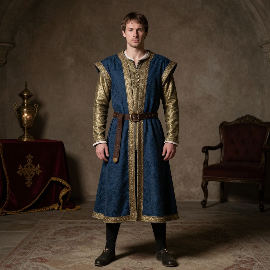Photograph of a Caucasian man with short brown hair and light skin, standing in a dimly lit, medieval-style room. He wears a blue, long-sleeved, knee-length tunic with gold embroidery and a brown leather belt, over a gold, long-sleeved shirt. He also wears black leggings and brown shoes. The background includes a dark brown, textured wall, a gold goblet on a maroon-draped table to the left, and an ornate, dark brown, upholstered chair to the right. The floor has a patterned rug. The man's expression is neutral, and he stands with his hands by his sides.