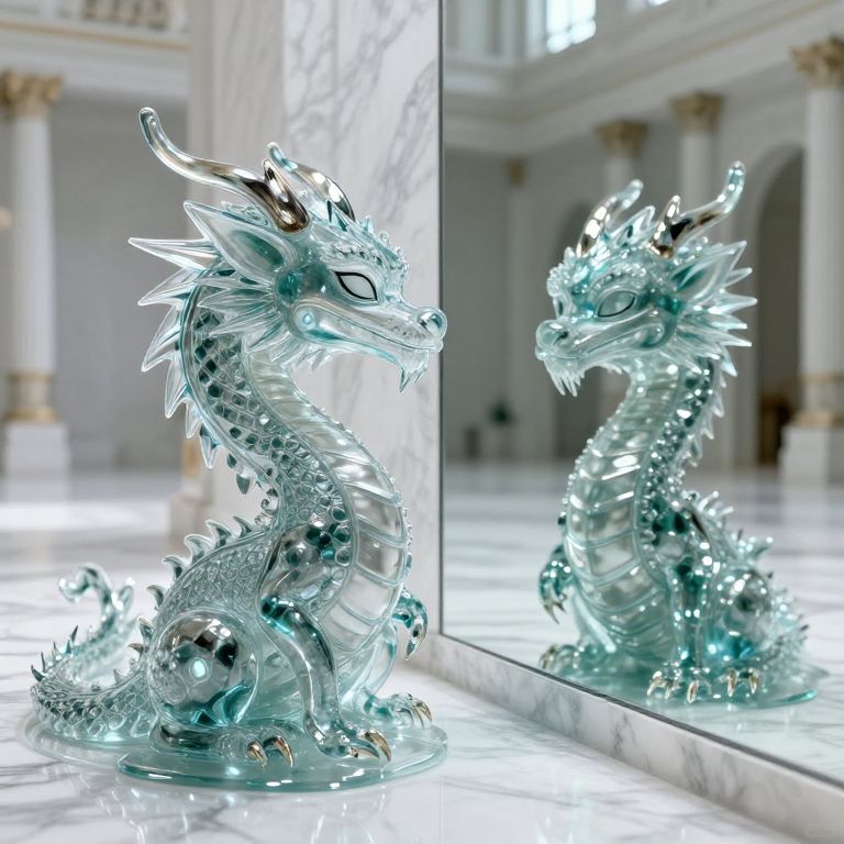 A dragon made entirely of liquid glass melts and reforms its shape each time it blinks, gazing endlessly at its own reflection in an endless marble hall.
