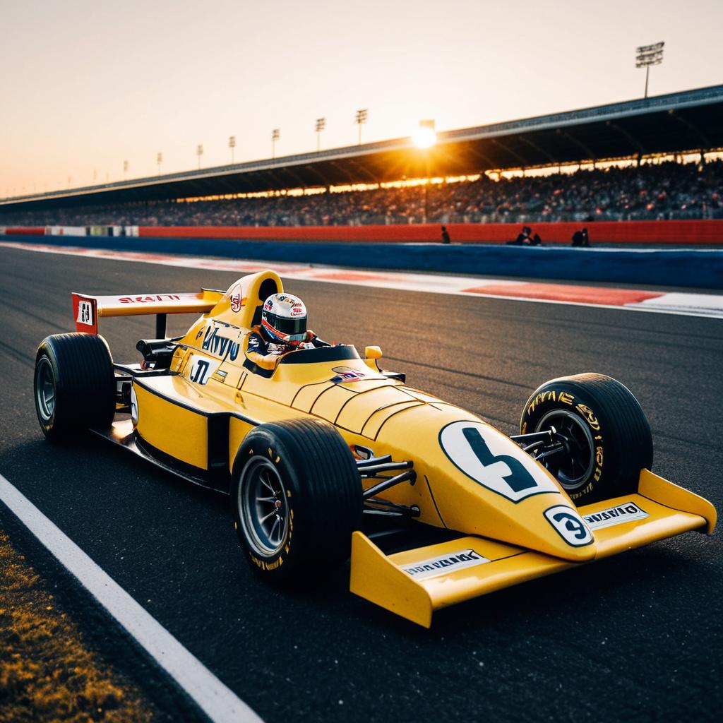 Ukiyo-E an f1 race car but the body of the vehicle is made of a twinkie, it is totally made of spongecake and frosting. every body panel is made of spongecake. ultra realistic on a race track, at sunset, cinematic lighting,