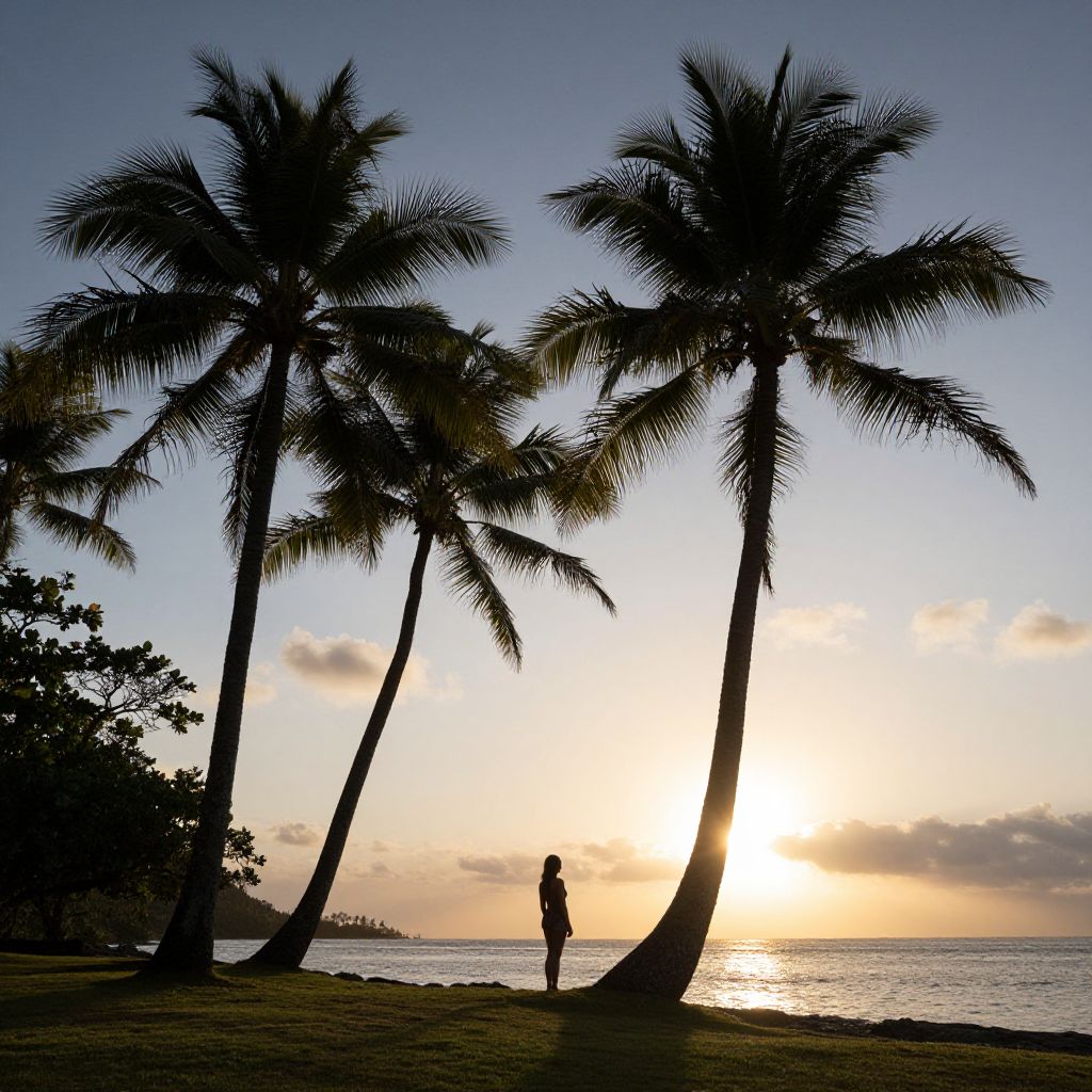 Silhouette of leaning palm trees and a woman at sunrise on Taveuni Island, Fiji, Pacific