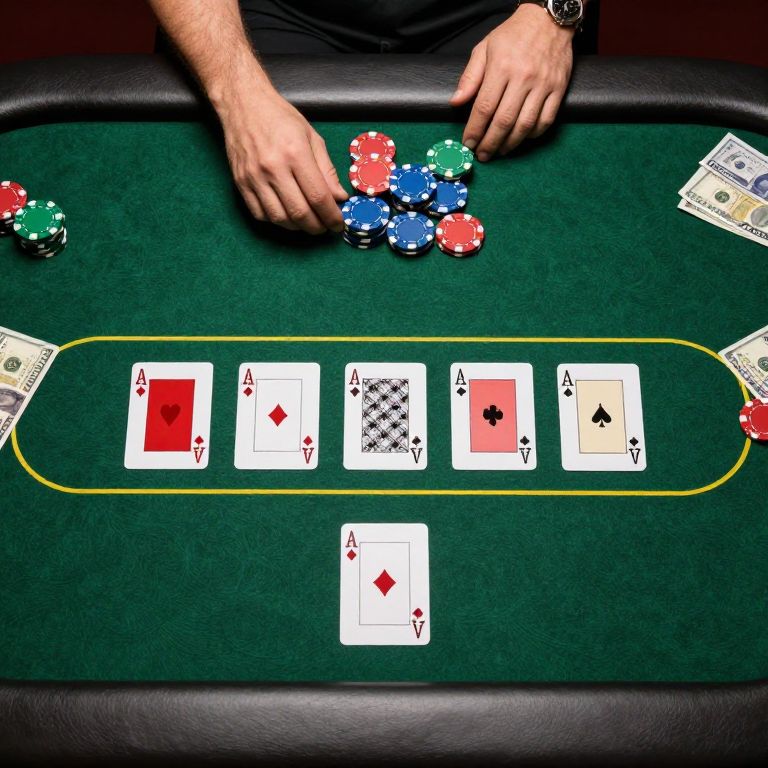 A poker table viewed from directly above, showing cards, chips, and money on the table.