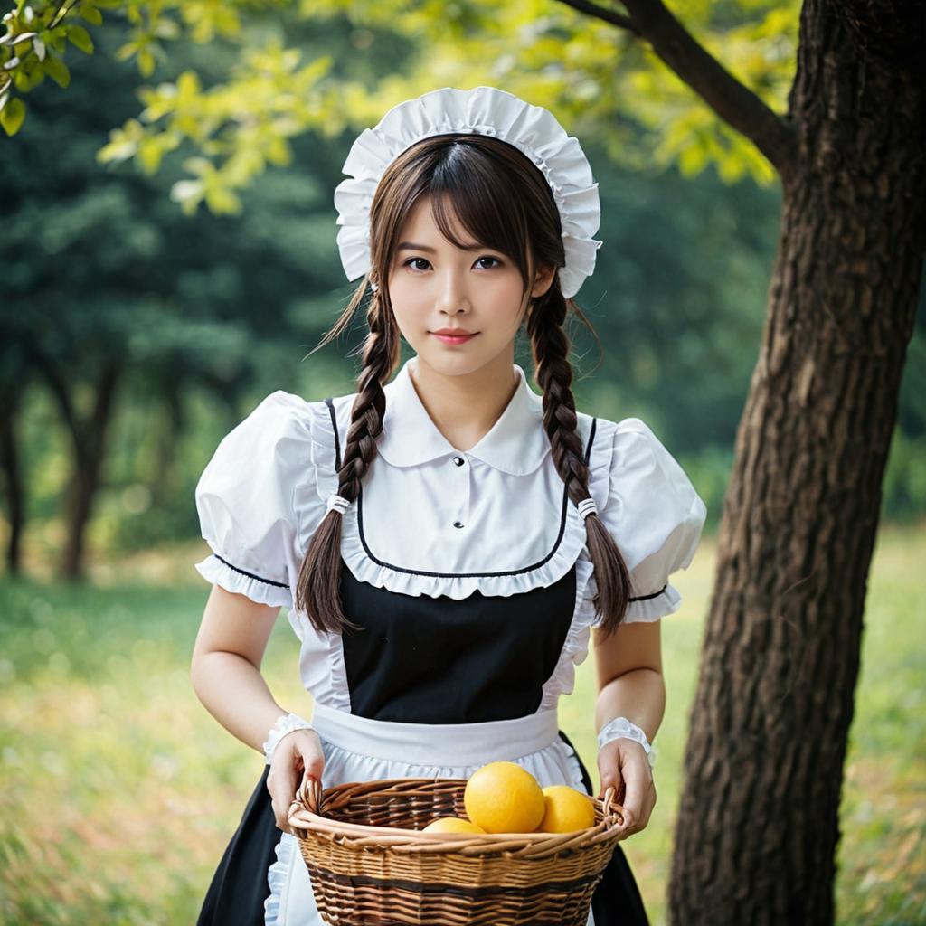Portrait of an Asian young woman with long brown hair wearing a light blue dress with white puffy short sleeves and decorative lacing on the bodice. She has white ruffled hair ornaments and gold hair clips, standing outdoors near a tree with a blurred green background.
