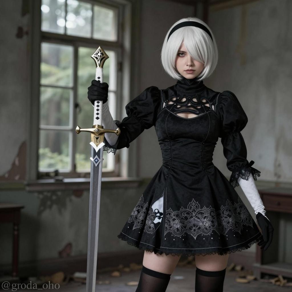 Cosplay photograph of a woman with short white hair, pale skin, and red lipstick. She wears a black, frilled Gothic dress with puffed sleeves, white gloves, black thigh-high stockings, and high-heeled boots. She leans against a metal railing with a sword in her right hand. Her expression is neutral. The background includes a modern building and blurred people. She is standing on a concrete pathway.