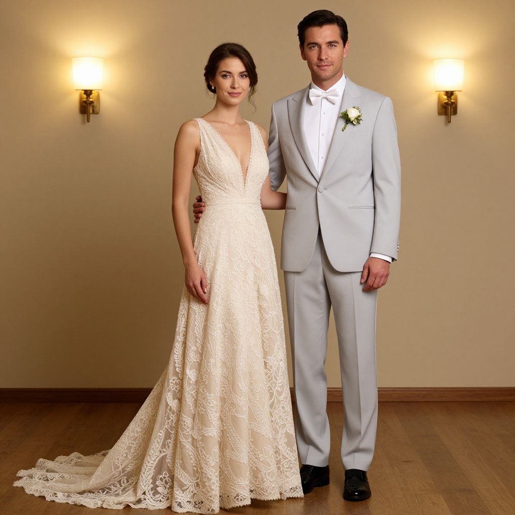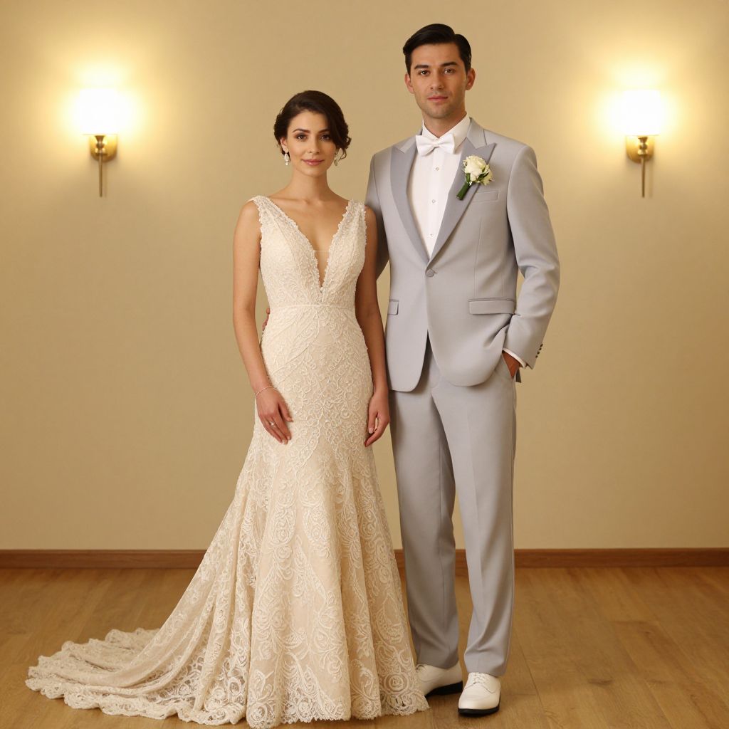 Elegant couple dressed in formal attire—woman in a cream lace wedding gown with a plunging neckline and man in a light gray tuxedo with a white bow tie and floral boutonniere—pose together indoors, exuding sophistication against a warmly lit backdrop featuring two wall sconces and a wooden floor.