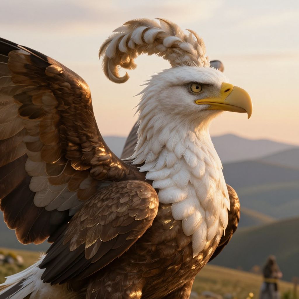 Imagine an enchanting portrait capturing a whimsical fusion between a majestic eagle and a gentle swan, reminiscent of Renaissance artistry. The creature's iridescent feathers seamlessly blend from white to ruffled brown with golden highlights, as if painted by a masterful hand. This unique avian is depicted in a close-up side view, its keen eyes gazing off into the distance from beneath an arch of elegantly curled wings. Against a dreamy backdrop of rolling hills and distant mountains bathed in golden hour sunlight, the delicate interplay of light and shadow across the creature's feathers creates a sense of depth and dimension, evoking both awe and wonder at this mythical hybrid that embodies the spirit of exploration and grace.