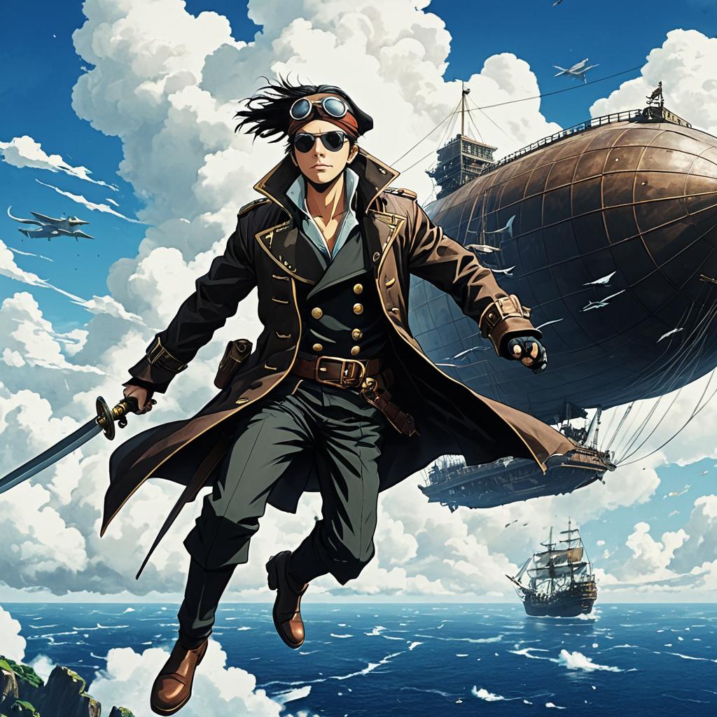 A noble sky pirate captain, wearing a charismatic leather trench coat and goggles, performing piloting a flying airship prowling battle, set in floating scattered islands above a cloud sea, drawn in the intense and visually striking anime style of Tite Kubo.