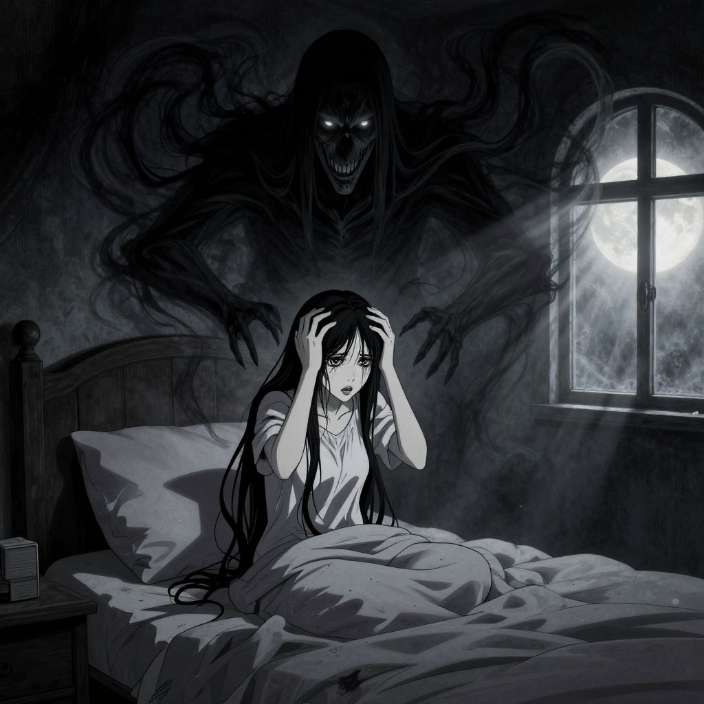 Digital anime-style drawing featuring a terrified young woman with long black hair, sitting up in a disheveled bed in a dark, moonlit room. She wears a white nightshirt, her hands gripping her hair. Behind her looms a menacing, shadowy figure with glowing eyes and a wide, sinister grin. The moonlit window on the right casts a eerie light, highlighting the woman's frightened expression. The bed has a wooden headboard, and a small stack of books is on the bedside table. The room's dark, textured walls add to the ominous atmosphere.