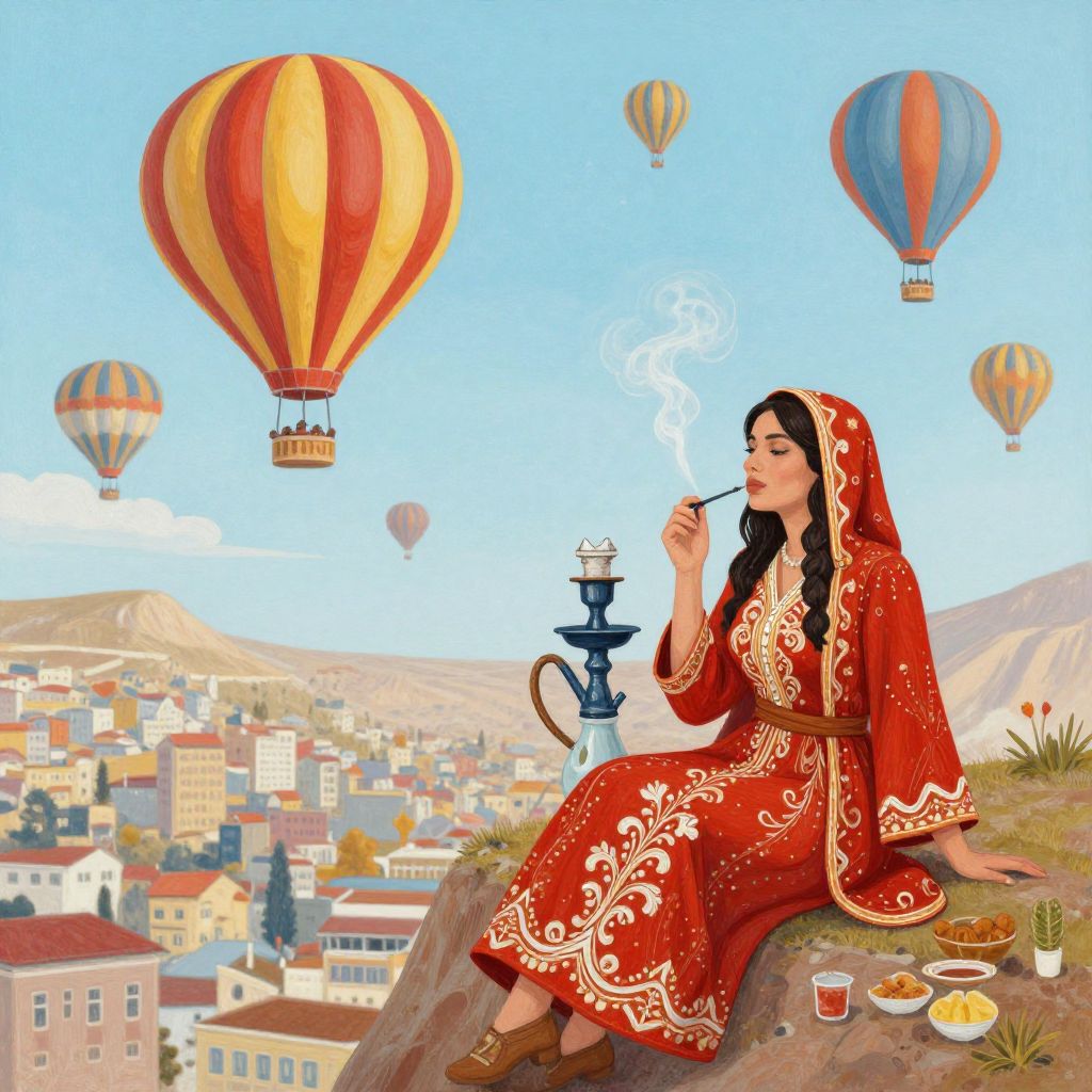 Digital illustration of a woman in a red, white-embroidered dress, smoking a hookah, surrounded by colorful hot air balloons over a city