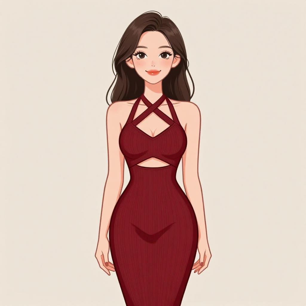 Woman with pretty face and pretty hair. smiling Woman, contemporary chic, bodycon midi dress in deep red, halter neck, cut-out detail at the torso, crisscross straps, knit fabric, subtle ribbed texture, light studio background. --sref 1467