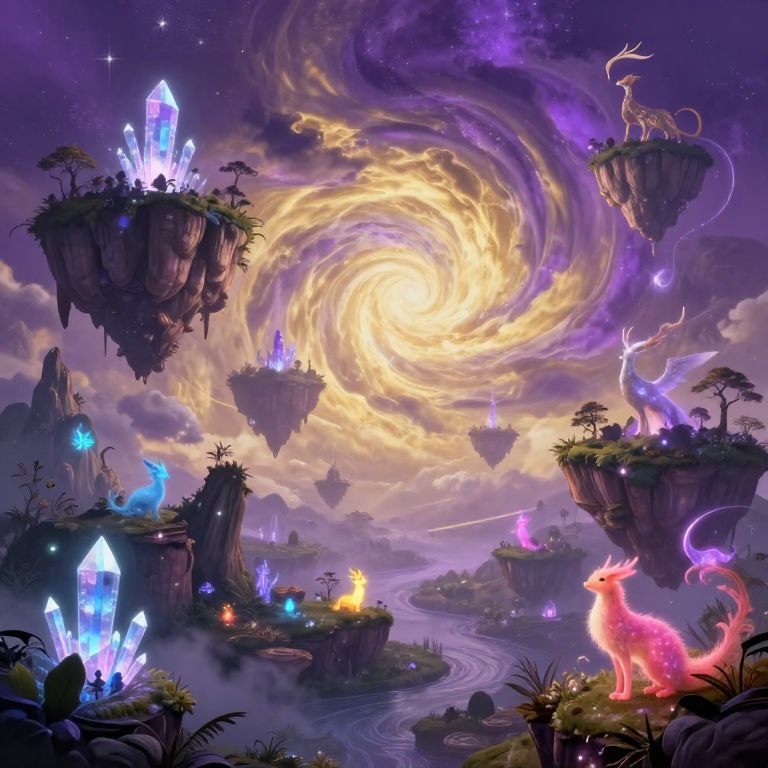 Fantasie landscape with surreal floating islands, glowing crystalline trees, and vibrant magical creatures under a swirling purple and gold sky, detailed digital art with a dreamy and mystical ambiance.