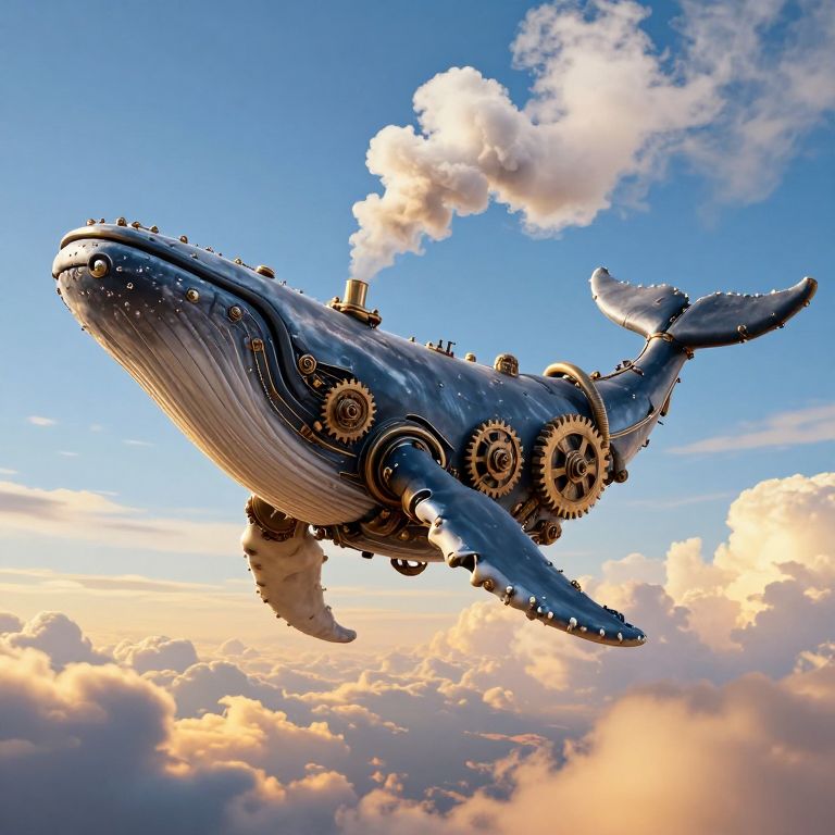 A steampunk-inspired 3D render depicts a colossal mechanical whale soaring through the sky, its body adorned with intricate gears and pipes, as it emits billowing clouds of smoke against a vibrant, high-definition backdrop of golden-hour clouds and a clear blue sky.