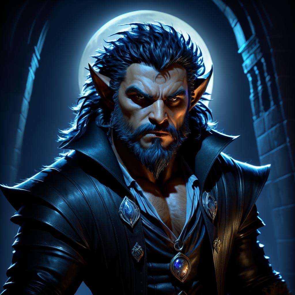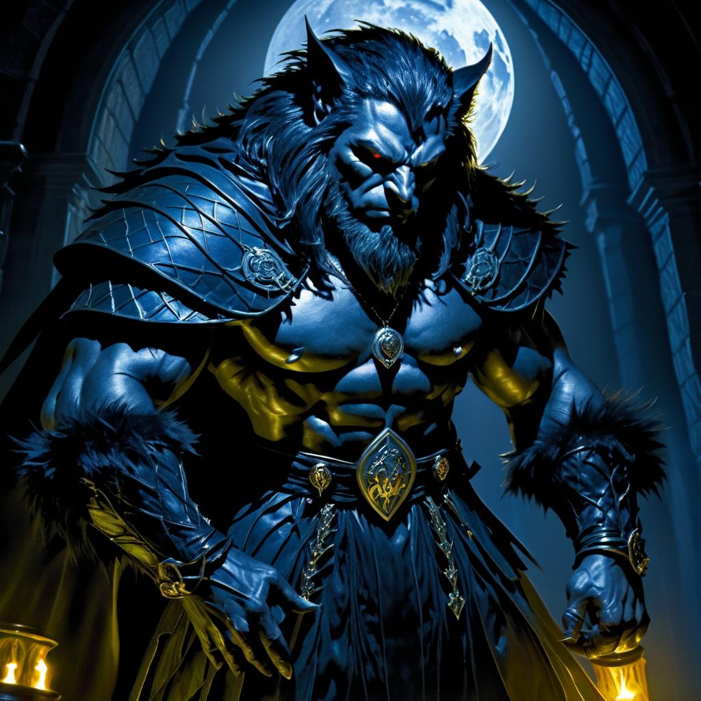 Highly detailed fantasy illustration of a muscular werewolf character with glowing red eyes, sharp fangs, and fur-covered upper body. The werewolf wears a dark feathered cloak and leather accessories, standing in a gothic archway illuminated by a bright full moon in the background. The scene is styled with cinematic lighting emphasizing the werewolf's fierce expression and supernatural presence.
