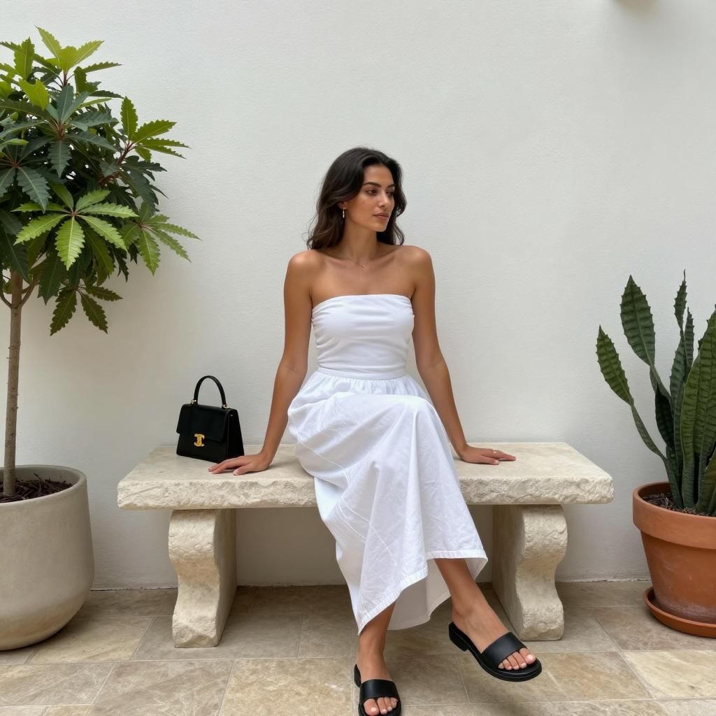 Woman with dark hair in white strapless dress, sitting on stone bench, wearing black sandals. Green plants on either side, ured white wall background. Small black handbag on bench. Slender, relaxed posture, neutral expression. Two potted plants.