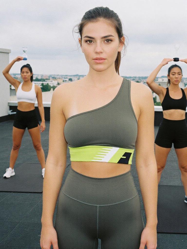 A hourglass woman in athletic wear, wearing an olive green asymmetrical crop top with a lime green and white logo elastic band, paired with high-waisted leggings, stands confidently at a fitness class on a rooftop. The scene is captured in the style of 3M analog film stock. Sexy. Pretty face and beаutiful eyes. Big breasts