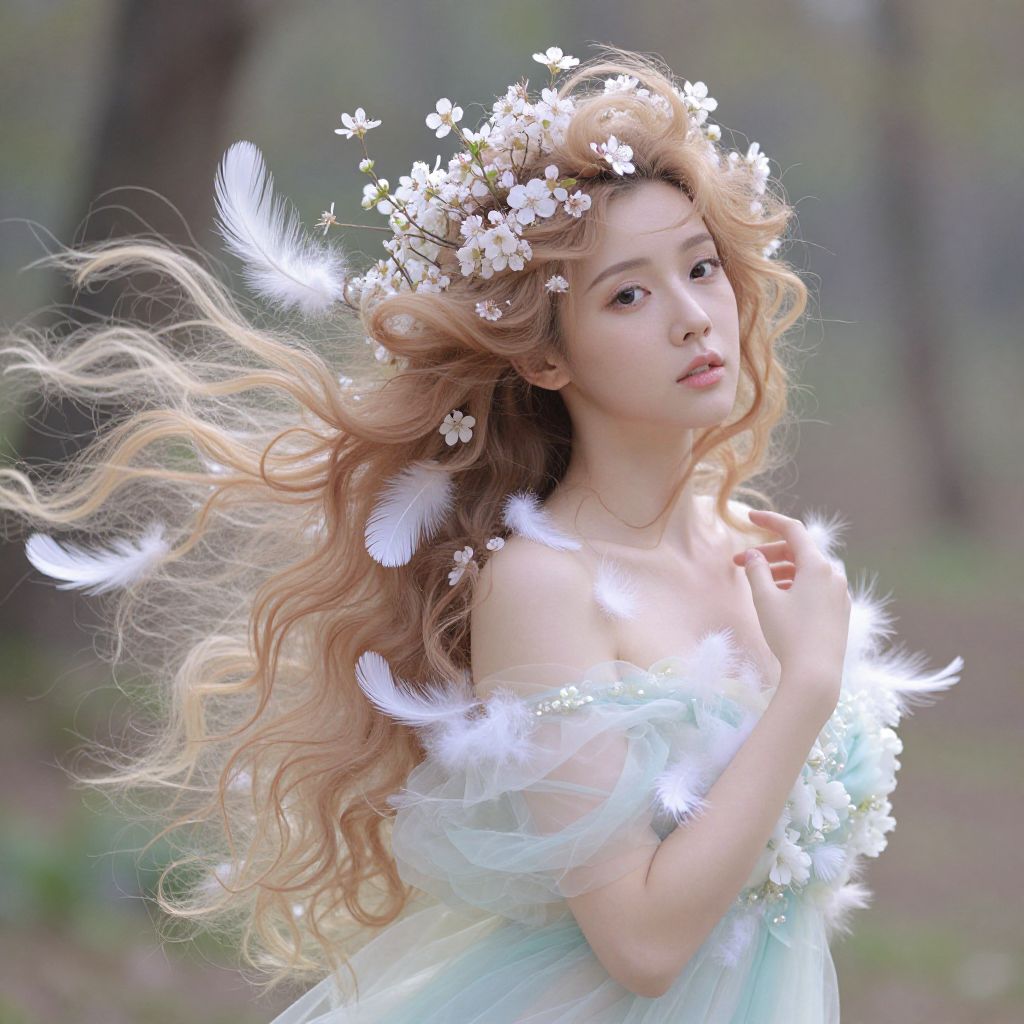 A photograph of an ethereal Asian woman with long, wavy, blonde hair adorned with white cherry blossoms. She wears a sheer, light blue dress and has white feathers floating around her. Her expression is serene, with slightly parted lips. The background is a blurred, natural forest setting, adding to the dreamy atmosphere. The soft lighting enhances the delicate textures of her hair, dress, and feathers, creating a magical, fairy-like effect. The image is highly detailed and vibrant, emphasizing her beauty and the gentle, airy elements surrounding her.