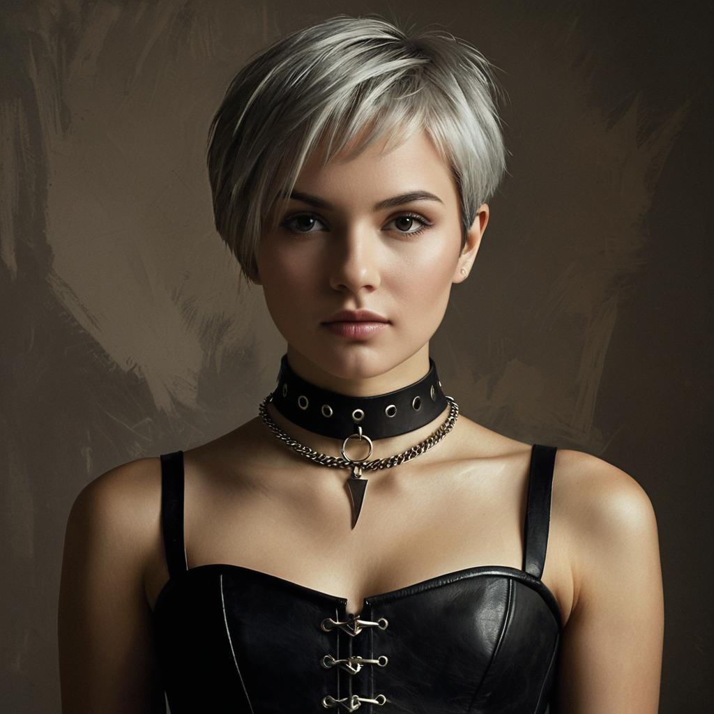 Sepia-toned realistic portrait of a confident young woman with wavy blonde hair styled in vintage 1930s waves. She is wearing a black corset dress with button details and a statement black necklace. The image features soft shading that highlights her delicate facial features, set against a plain textured beige wall background.