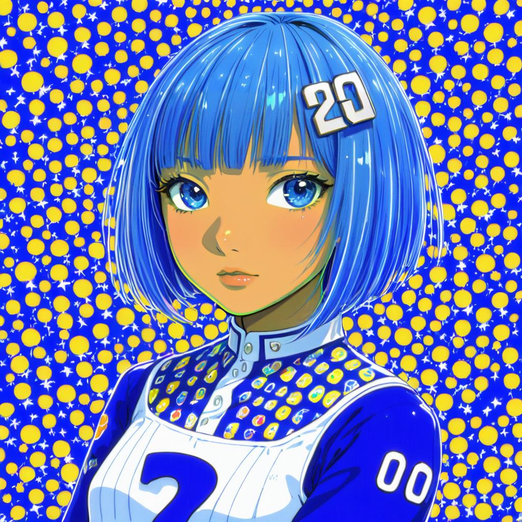 Digital anime-style illustration of a girl with short blue bob-cut hair, bright blue eyes, and a number 3 hair ornament. She wears a blue athletic top with white numbers and elbow gloves, set against a patterned blue and black background featuring circular shapes.