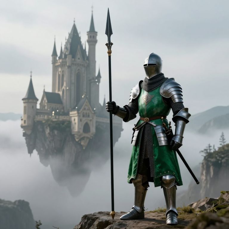 Photorealistic digital artwork of armored knight with green tunic and silver armor, standing on cliff, holding spear, overlooking floating castle in misty,