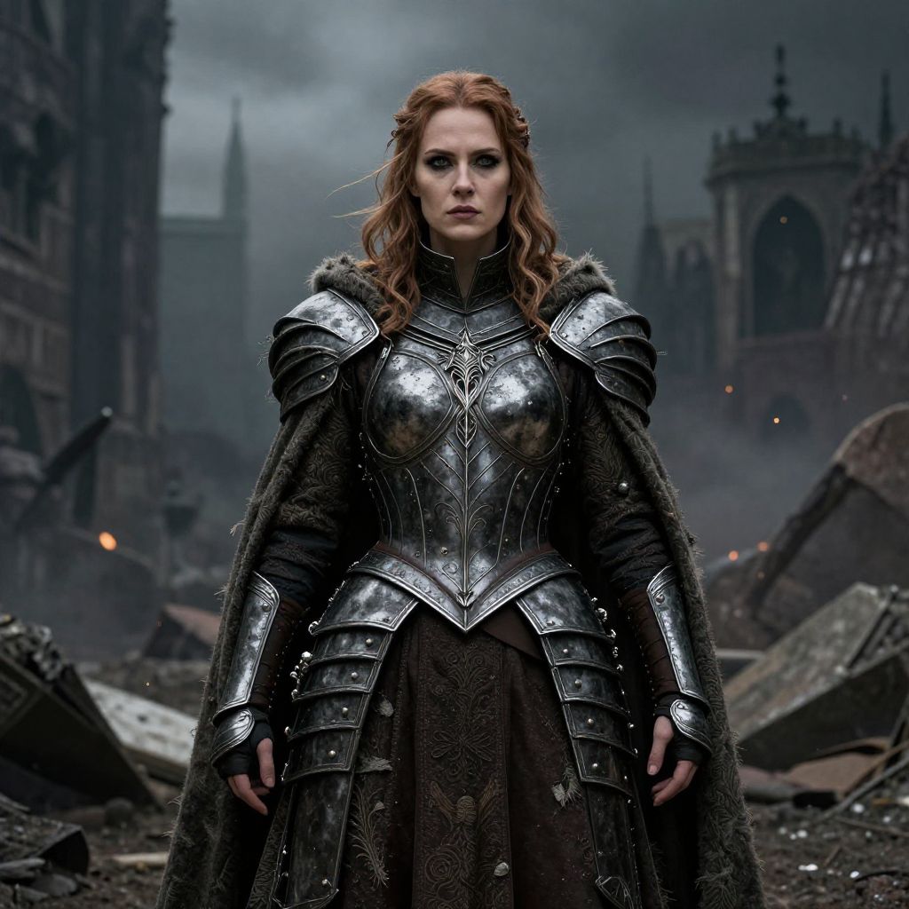 Photograph-style digital artwork of a stern-looking red-haired woman in medieval-style, silver-plate armor with intricate patterns. She wears a dark, fur-trimmed cape over a brown, patterned dress. Her armor includes shoulder guards and gauntlets, and she stands amidst a ruined, gothic cityscape with shattered stone and debris under a cloudy, gray sky. Gothic spires and arched buildings loom in the background, adding a sense of desolation and grandeur. Her expression is determined, and the overall mood is dark and epic.