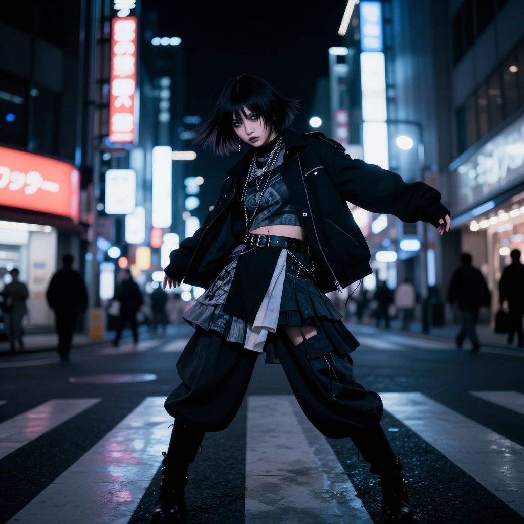 Jirai kei anime girl with dark makeup and layered clothing, dynamic pose on bustling city crosswalk, glowing signs and reflections, dark aesthetic with futuristic vibe