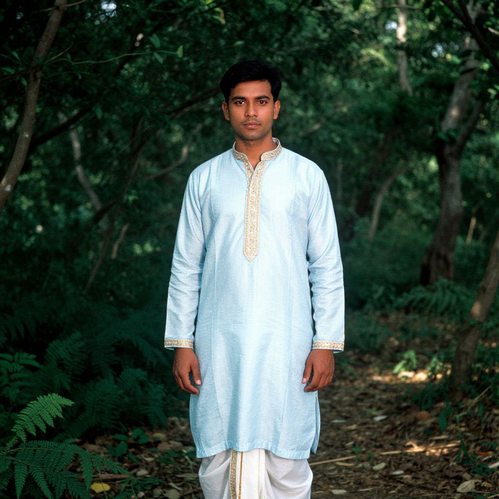 A man, light blue cotton Panjabi, white silk dhoti, intricate gold embroidery, relaxed fit, standing in lush green canopies, dappled sunlight, tranquil forest floor, vintage eastman film stock, serene expression. Man has masculine face and piercing eyes