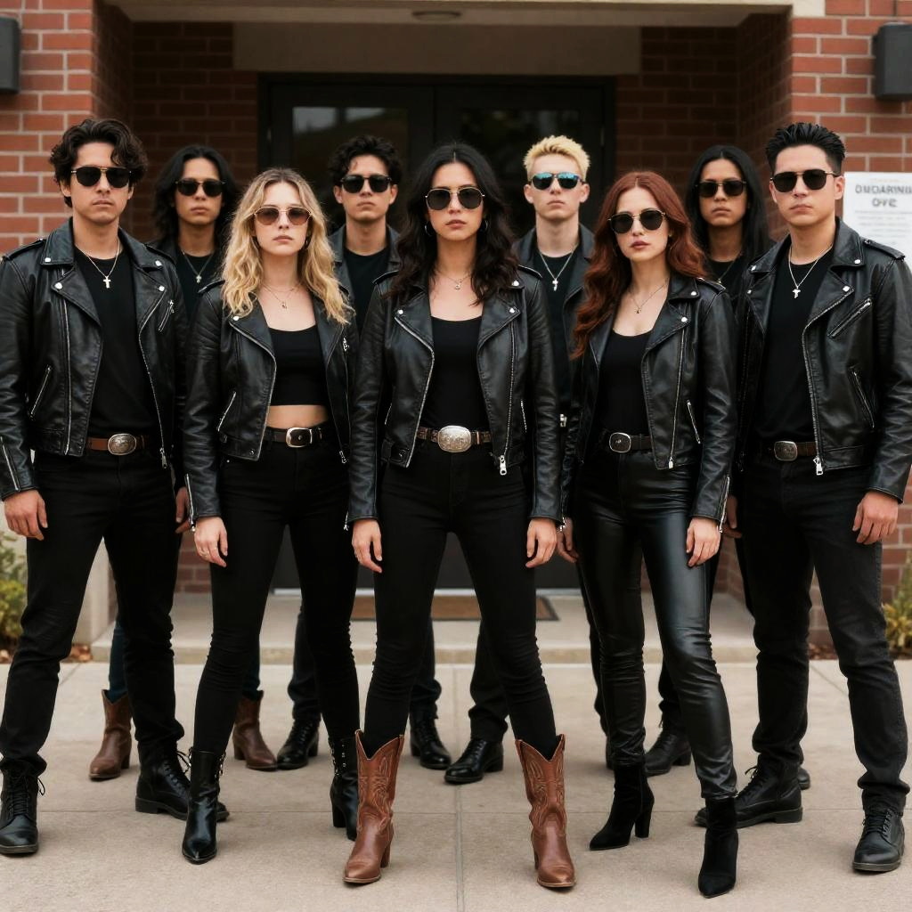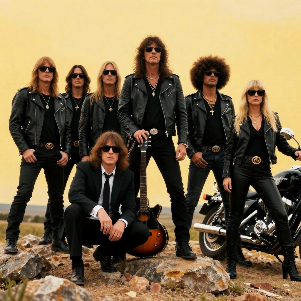 Photograph of six rock musicians in leather jackets and sunglasses standing on a rocky hill, against a yellow-orange sky. One man with long hair and sunglasses stands in the center holding a guitar. Another with a large afro stands to his right. A blonde woman in a leather jacket and sunglasses stands to the far right, next to a motorcycle. A man in a suit and tie kneels in the foreground, looking up. Four other men stand behind them, all in leather outfits. Bright, intense facial expressions.