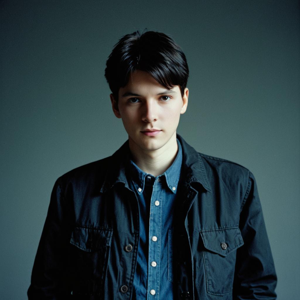Self outfit, Joy Division Bernard Sumner, slender man, short dark hair, pale skin, classic 1980s British post-punk look, crisp buttoned shirt, slim dark jacket, bloom, bokeh, simple background