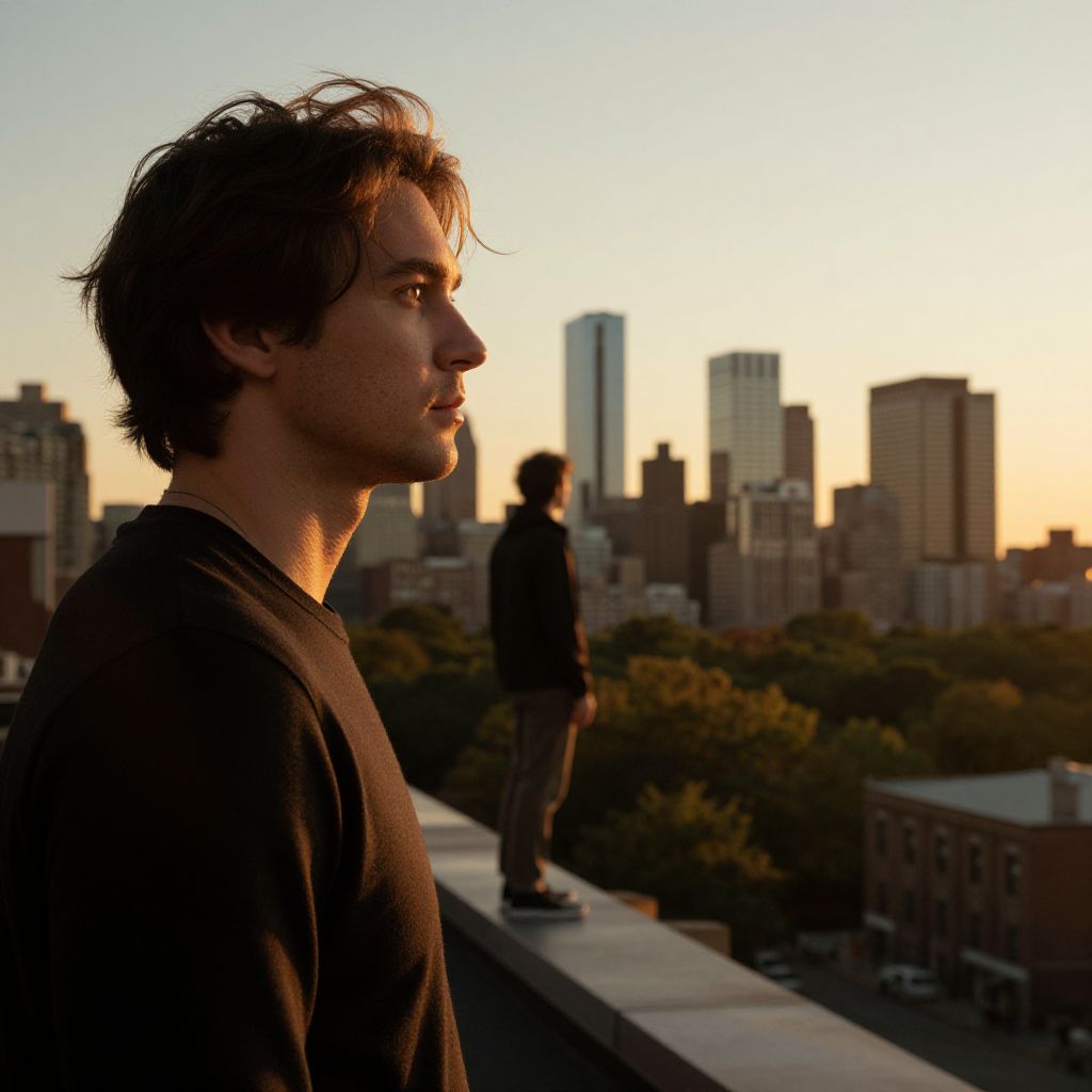 Photograph of a young man with tousled brown hair and light skin, wearing a dark brown, long-sleeve shirt, standing in profile on a rooftop at sunset. His expression is serious and contemplative. In the background, a silhouette of another person stands on the same rooftop, with a city skyline featuring tall buildings and a warm, golden sky. The foreground includes a concrete ledge and some green trees below, adding depth to the urban setting. The light creates a dramatic contrast between the subject and the background.