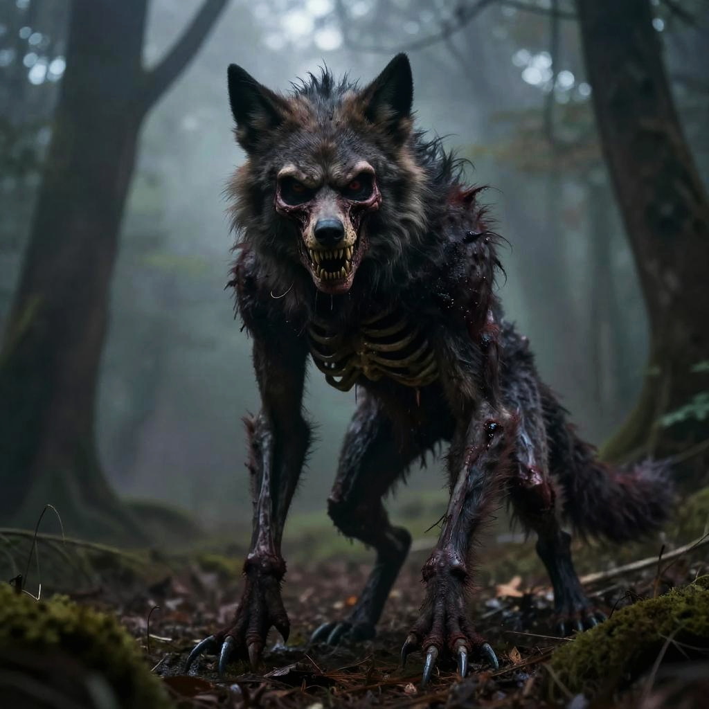Digital artwork of a menacing, skeletal, wolf-like creature with dark fur and glowing eyes, standing in a misty, eerie forest.