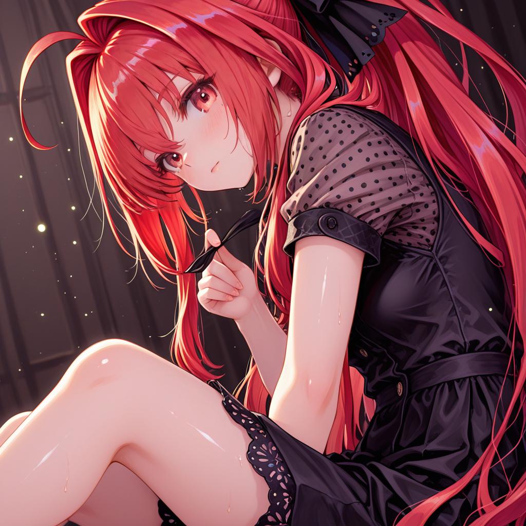 Digital artwork of an anime girl with very long red hair styled in a ponytail with ahoge and hair intakes. She has red eyes, fair skin, and is wearing a black dress with a polka dot pattern on the sleeves, featuring lace details. The character appears contemplative with a soft expression, set against a dark background.